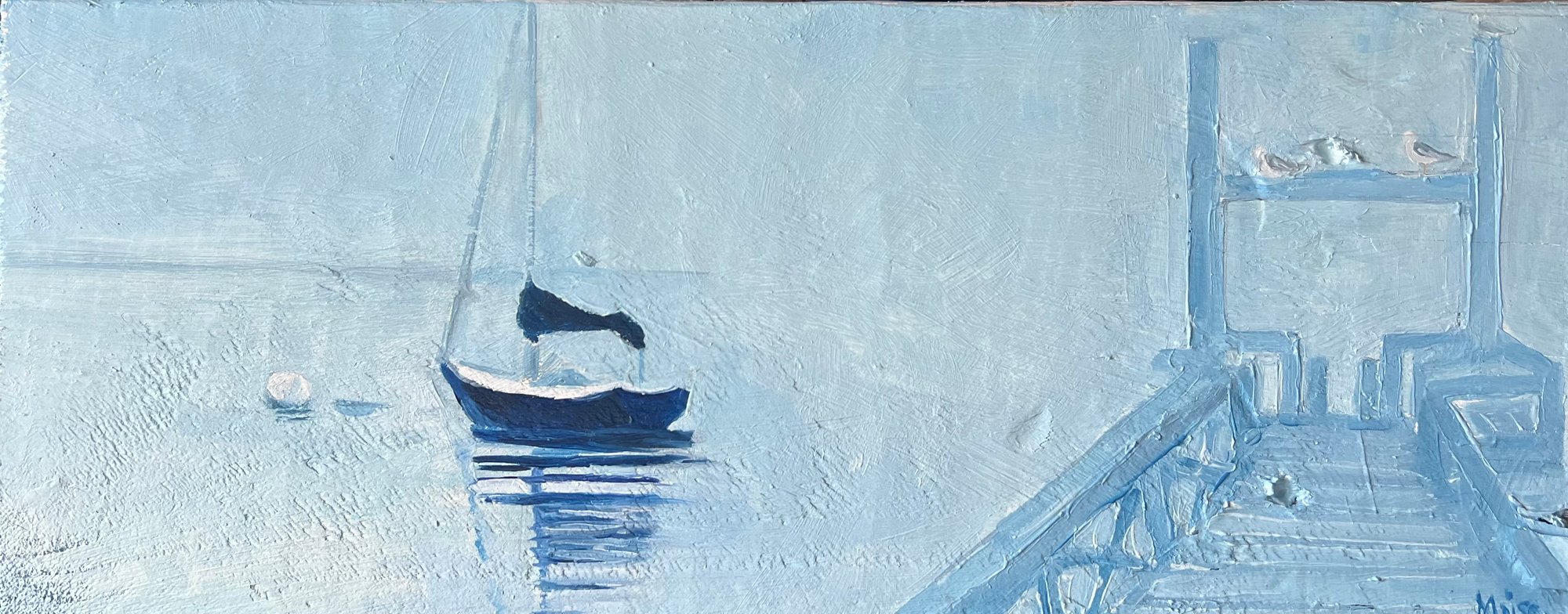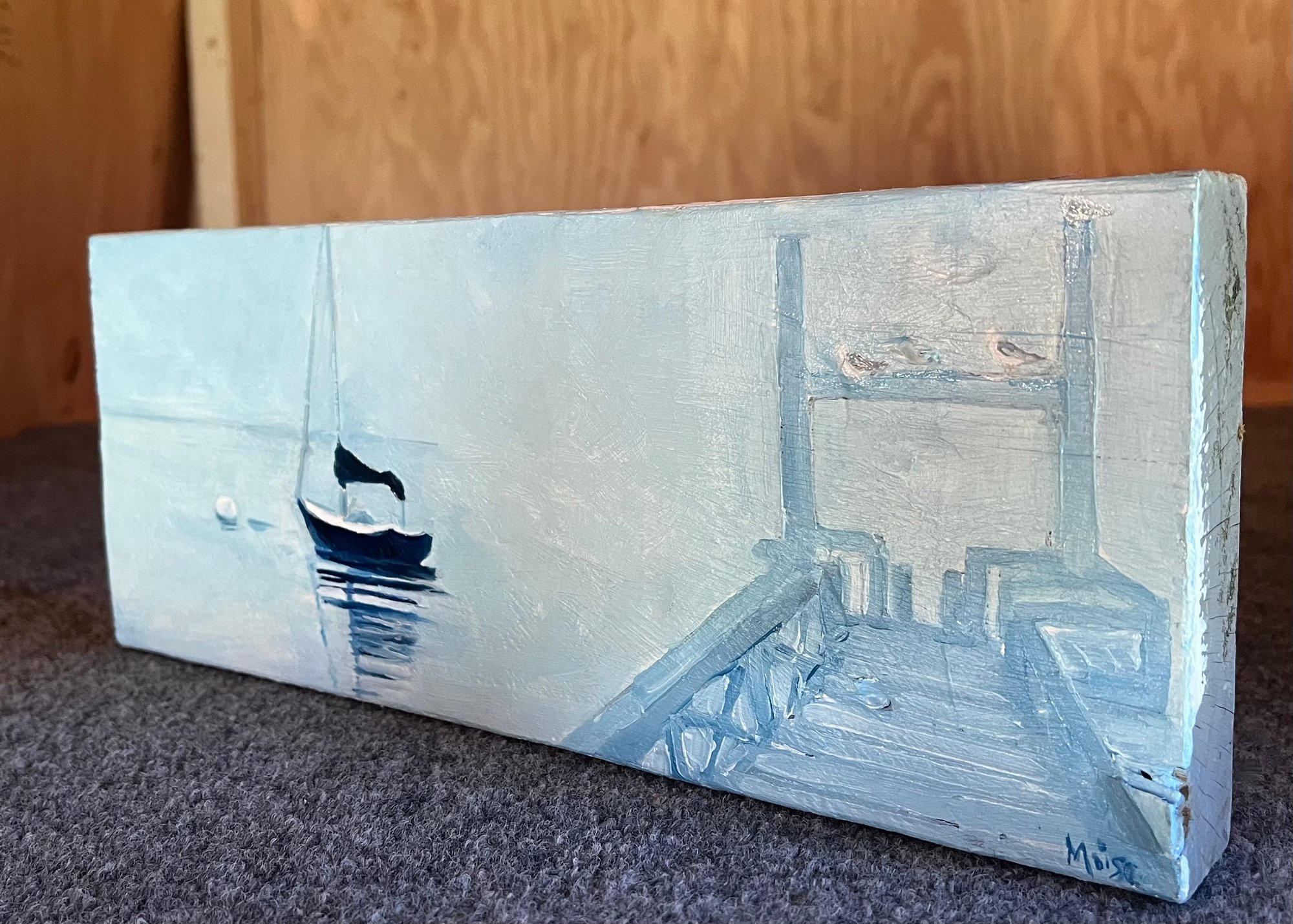 Oil on Wooden Board salvaged from Hancock Point Wharf, sent to shore by the January 10th, 2024 storm that tore apart and destroyed the wharf, along with many others up and down the coast of Maine.