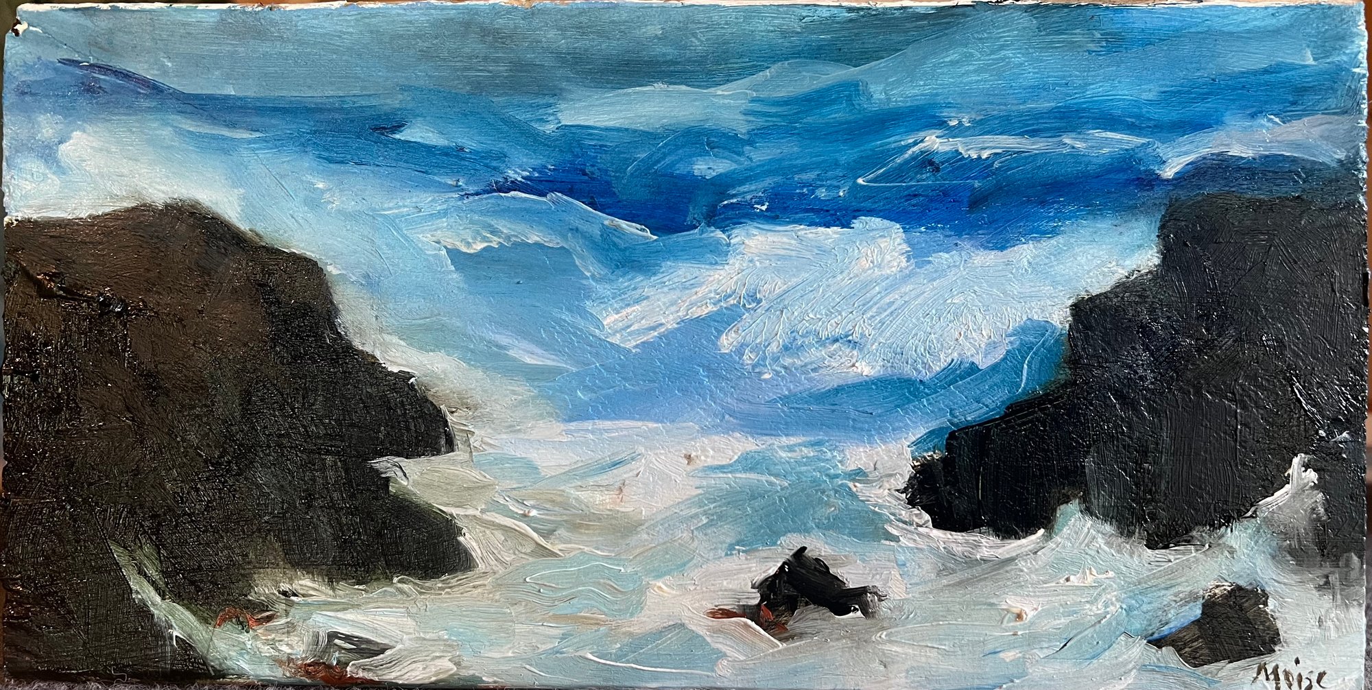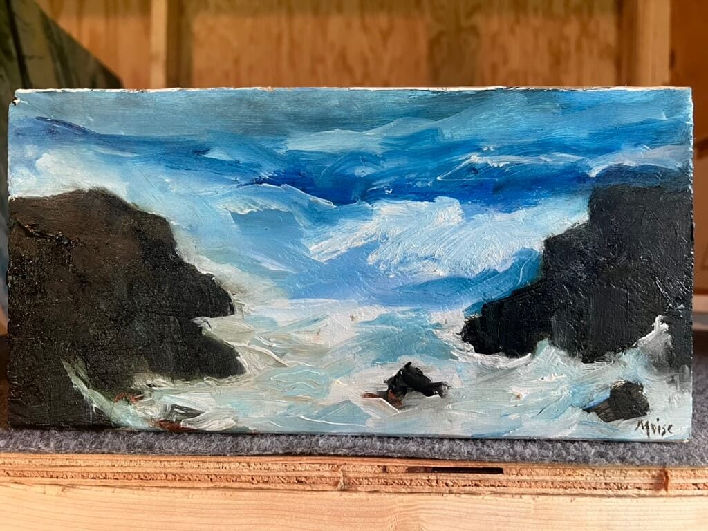 Oil on Wooden Board salvaged from Hancock Point Wharf, sent to shore by the January 10th, 2024 storm that tore apart and destroyed the wharf, along with many others up and down the coast of Maine.