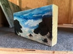 In the aftermath, grey painted boards washed ashore. I dragged some home and cut them into pieces. This painted wooden block can sit on a shelf for display.