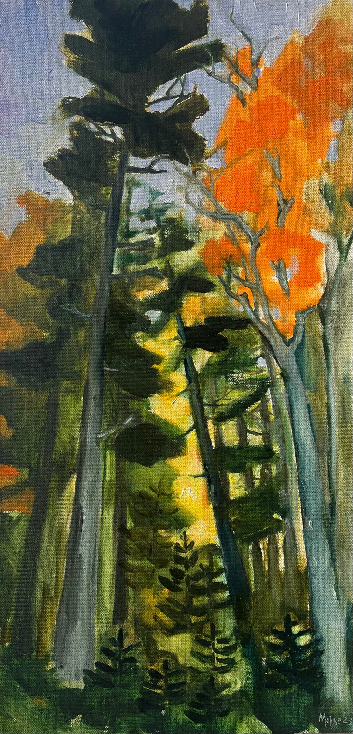 This fall the light behind the colors has captivated me, as well as the towering white pines against the purples of the cloudy sky. Crows danced above, and tiny spruces grow at the feet of the giants