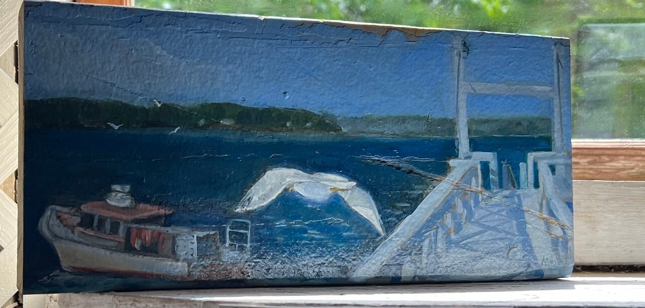 Painted on a salvaged fragment of the Hancock Point Wharf. In January of 2024 two massive storms hit the Maine Coast at high tide 3 days apart. The first storm took out many piers along the Maine Coast, and the second storm inflicted even more damage on structures remaining and the shoreline.